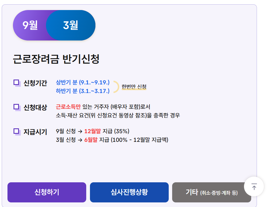 | 반기 신청 | 2024년 하반기 | 2025년 3월 1일 ~ 3월 17일 | 6월 말 | 근로소득자 |